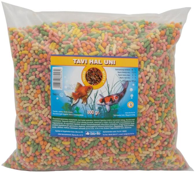 HALTÁP BIO-LIO TAVI HAL UNI 0,8 5L Pálcika formájú általános kerti tavi haltáp. A víz tetején úszó kevert összetevőkkel és ízekben. Összetett takarmány aranyhalak, tavi halak számára. Könnyű fajsúlya miatt a víz színén lebeg. Naponta többször annyi eleség javasolt, amennyit a halak rövid idő alatt maradéktalanul elfogyasztanak. Az egyoldalú táplálás okozta hiány