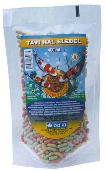 Bio-Lio Haltáp Tavi Hal Eledel 400ml Összetett takarmány aranyhalak, tavi halak számára. Könnyű fajsúlya miatt a víz színén lebeg. Naponta többször annyi eleség javasolt, amennyit a halak rövid idő alatt maradéktalanul elfogyasztanak. Az egyoldalú táplálás okozta hiánybetegségek elkerülése érdekében, kiegészítőként állati eredetű táplálékot (pl: gammarus, daphni