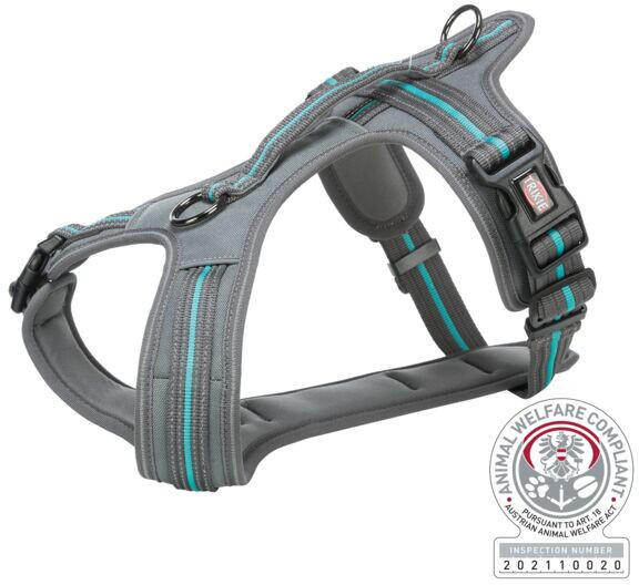 Trixie Fusion Touring Harness - Neoprén túrahám fogóval és állítható haspánttal, kiegészítő gyűrűvel a póráz rögzítéséhez a mellkas és a nyak részén. Nyakpánt csattal a könnyű fel- és levételhez. Fényvisszaverő csíkokkal. Szürke / narancs, illetve szürke / óceánkék színekben.