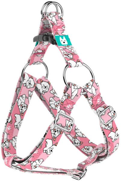 Westi mintás belépős hám kutyádnak különböző méretekben. Öltöztesd kedvenced hazai gyártású egyedi belépős hámunkba, amit kérhettek trendi rose gold, mindig elegáns ezüst fém alkatrészekkel vagy könnyű műanyag csattal. Ahhoz, hogy ezeket a különleges mintákat meg tudjuk alkotni, műhelyünkben nyomtatjuk a hevedert. Minden terméket csak igény esetén gyártunk le, í