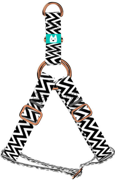 Absztrakt, geometrikus mintás belépős hám kutyádnak különböző méretekben. Öltöztesd kedvenced hazai gyártású egyedi belépős hámunkba, amit kérhettek trendi rose gold, mindig elegáns ezüst fém alkatrészekkel vagy könnyű műanyag csattal. Ahhoz, hogy ezeket a különleges mintákat meg tudjuk alkotni, műhelyünkben nyomtatjuk a hevedert. Minden terméket csak igény esetén