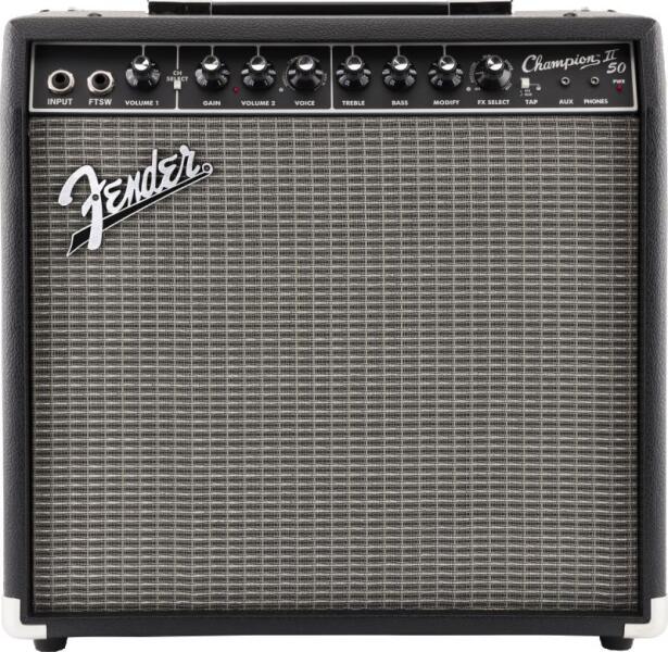 Fender Champion II 50 gitárkombó 50 Wattos erõsítõ 12"-es Fender Special Design hangszóróval, 2 csatornával, egy bemenettel, zengetõ, késleltetõ/visszhang, kórus, tremolo, Vibratone és más effektekkel, különféle erõsítõhangzásokkal és torzítótípusokkal, 3,5 mm-es segédbemenettel és fejhallgató kimenettel. Fõbb jellemzõk: Széria: Champion Erõsítõ típusa: Digitáli