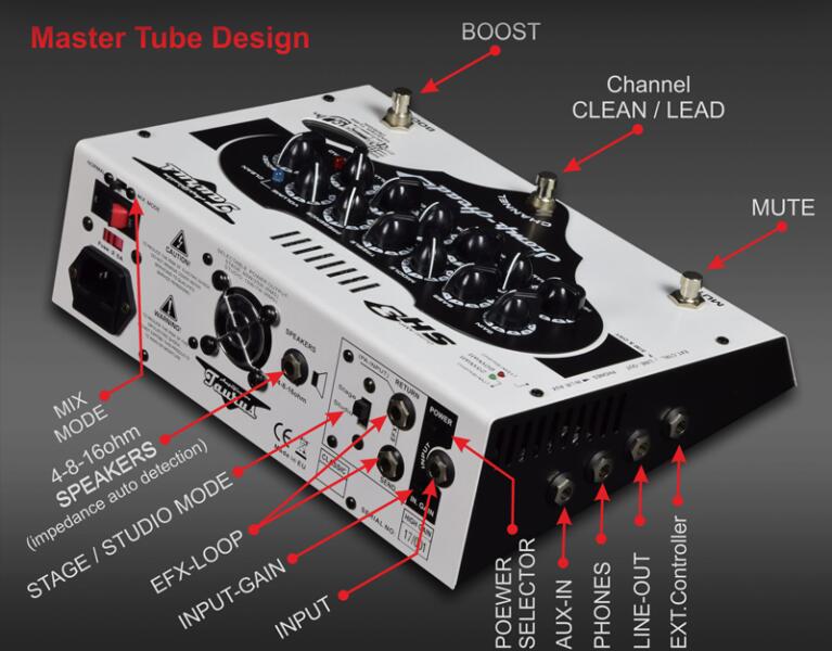 Csöves gitárerõsítõ fej, 30 Watt Teljesítmény: 30 Watt Hangszóró: - Impedancia: - Csövek: 4 x ECC83 /12AX7 elõfok, 4 x EL84 végfok Csatornák száma: 2 Vezérlõk: Fat csatorna: hangerõ, hangszín, gain, Tiny terror csatorna: hangerõ, hangszín, gain, csatornaváltó, teljesítmény kapcsoló, kimeneti teljesítmény kapcsoló (2 output tubes/ 4 output tubes) Effekt: - Analóg csatla