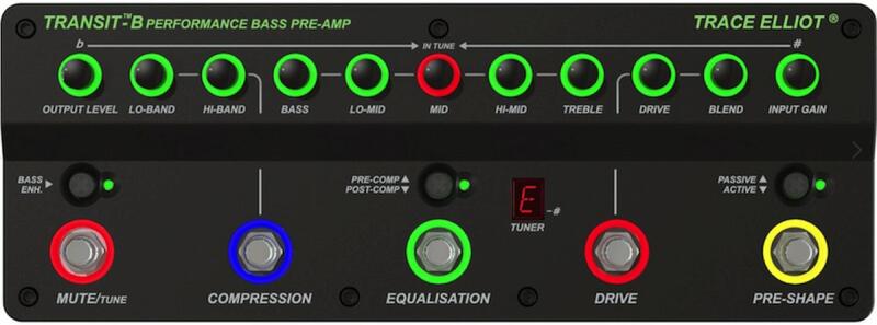 TRACE ELLIOT TRANSIT B Basszus Előfok A Transit B pedál egy professzionális minőségű előerősítő az igényes basszusgitárosok számára. A beépített szolgáltatások, mint a Pre-Shape, az 5 sávos félparaméteres EQ és a kettős kompresszor könnyen kezelhetővé teszik a pedált. Az olyan funkciók, mint a Drive és a keverésvezérlés, valamint a beépített mélyhang kiemelés, m