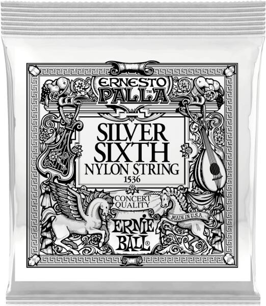 'E6' (vastag E) szálhúr klasszikus gitárhoz Ernie Ball nylon ezüst sodronyos E6 szálhúr. A gyártás során egy ezüstözött rézszálat tekernek körbe egy nylon szálakból sodrott vezetőszálon (több száz vékony szálból készül).