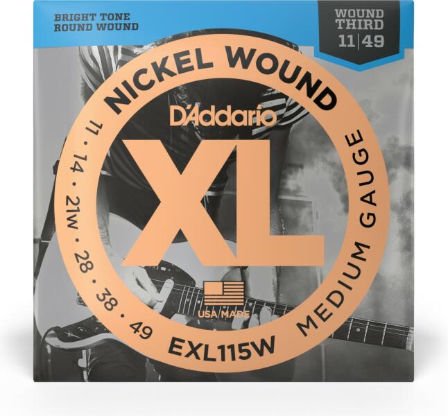 D'Addario EXL115W Nickel Wound elektromos gitárhúr, Wound G, Regular Light 11-49 XL Nickel Round Wound széria nikkelezett palást, körhuzallal csavart húrok (round wound), acél mag, húrvastagság: 11, 14, 21(w), 28, 38, 49