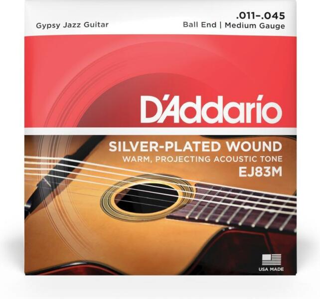 D'Addario EJ83M Gipsy Jazz akusztikus gitárhúr Húrvastagság: 11-45 Anyag: magas carbontartalmú acélmag és ezüstözött bevonat Hangszín: mélyebb, perkusszív Kialakítás: Ball end Húrvastagságok: . 011, . 015, . 024, . 029, . 035, . 045