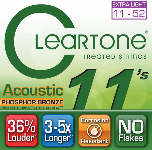 CLEARTONE CT7411 Akusztikus Gitár Húrkészlet Foszfor Bronz Custom Light 11-52 11-15-24-32-42-52 Utálod a bevonatos húrokat? Mi tudjuk miért... A legtöbb bevonatos húr olyan rétegeket használ, amik megölik a hangszínt, gátolják a vibrációt. Azaz hiába hosszabb a húr élettartama, ha a hangzás nem az igazi. Ezzel szemben a Cleartone az iparágban létező legvékonyabb bevonatot a