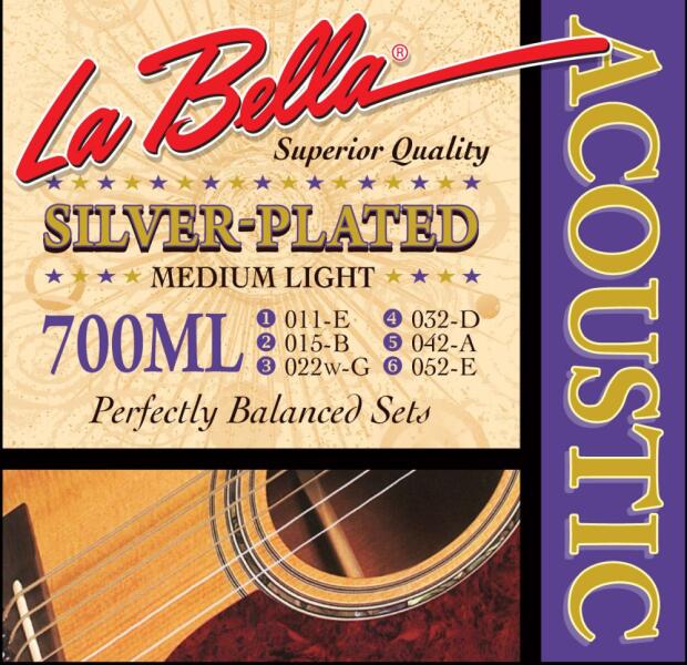 LaBella 700ML Akusztikus Gitár Húrkészlet Silver-Plated Medium Light, 011-052 LaBella 700ML Kiváló minőségű Akusztikus Gitár Húrkészlet . 011, . 015, . 022W, . 032, . 042, . 052 Medium Light Made in USA