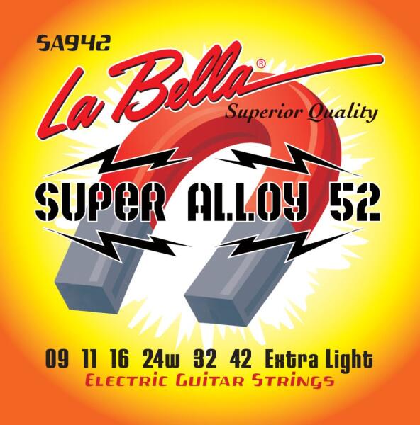 LaBella SA942 Elektromos Gitár Húrkészlet SUPER ALLOY 52 Extra Light 009-042 LaBella SA942 Elektromos Gitár Húrkészlet SUPER ALLOY 52 (52% Nickel-48% Iron) 009, . 011, . 016, . 024w, . 032, . 042 Extra Light Made in USA