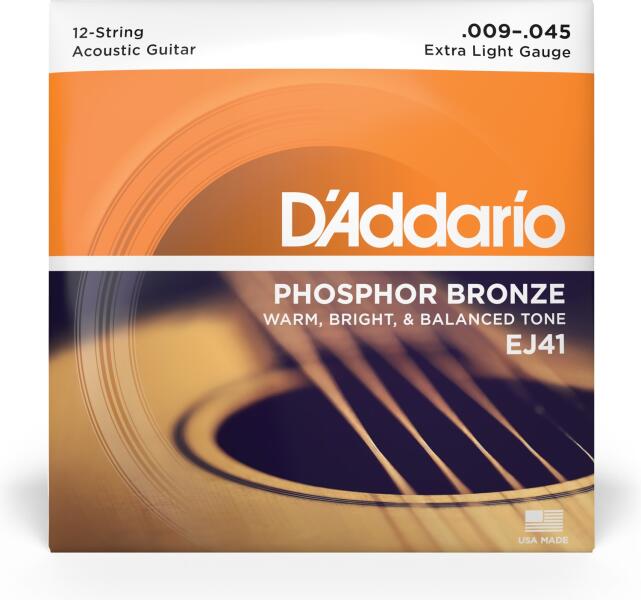 D'Addario EJ41 Phosphor Bronze 12-húros akusztikus gitárhúr, Extra Light 9-45 Anyag: foszfor/bronz Vastagság: . 009-. 009, . 013-. 013, . 021-. 008, . 029-. 011, . 036-. 016, . 045-. 026