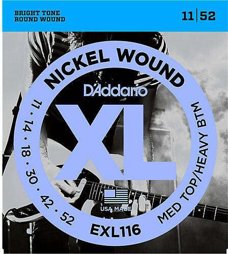 XL Nickel Round Wound széria nikkelezett palást, körhuzallal csavart húrok, acél mag, húrvastagság: 11, 14, 18, 30, 42, 52, Medium Top / Heavy Bottom