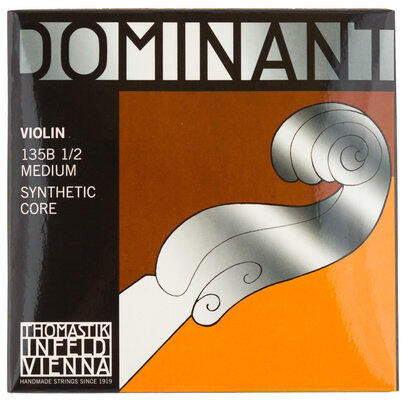 húrkészlet hegedűhöz: szett 1/2-es hegedűhöz, Dominant széria, rendkívüli flexibilitás, stabil hangolás extrém körülmények között is, gazdag, meleg hangzás, szintetikus mag, króm bevonat, húrvastagságok: 129, 131, 132, 133, kézzel készített húrok