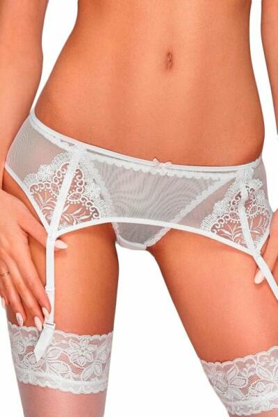 Obsessive Bianelle harisnyatartó. Nagyon finom szélein kissé rojtos csipkéből készült harisnyatartó, melynek derékpántja hátul 1x3-as kapocssorral záródik, de természetesen rugalmas, gumis anyagból készült, ahogyan méretre állítható tartópántjai is. A harisnyatartó pántok tövénél apró, igazgyöngy imitátum díszítőelemet találunk. A harisnya és a tanga sajnos nem