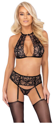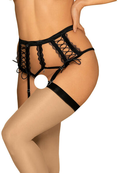 Fekete fehérneműben feltűnik a világos női bőr, ami a férfiaknak is finom. Elöl egy kis masni teszi teljessé a harisnyakötőt játékossággal. Az egész darab finom csipkéből van varrva, mely egyszerű virágmintával díszített. Az öv hátul két sorban akasztón rögzíthető, így alkalmazkodik a női alakhoz, könnyen levetkőzhető és felöltözhető . A harisnyakötő övek h