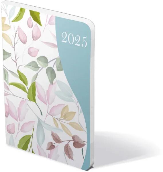 Színes papírborító soft-touch fóliával, kétnapos beosztással és 240 oldal jegyzetlappal. Présfólianyomással egyediesíthető.