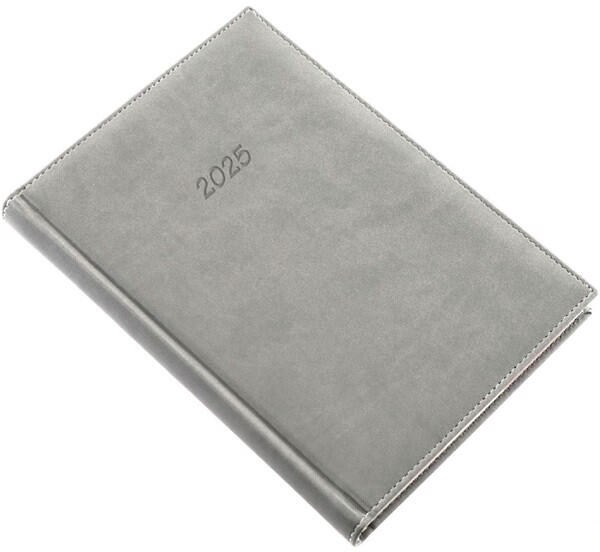 Realsystem 2025 Bolero 5322-43 A5 napi beosztású szürke határidőnapló Puha tapintású, hőre színeződő matt műbőr, világos varrással, jelzőszalaggal és sarokperforációval. A5 napi beosztású, 352 oldal, 70g-os chamois papírral, cérnafűzéssel. Egyediesítés: présfólia, vakdombor, fémsarok (arany/ezüst). Méret: 145x205 mm