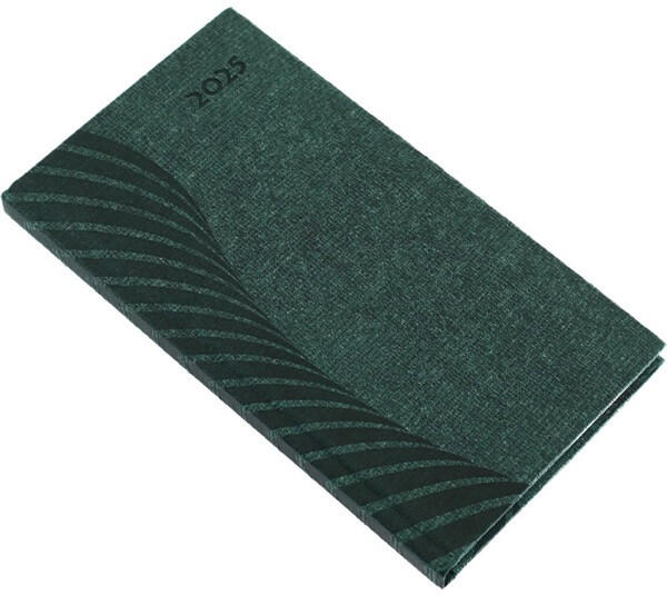 Realsystem 2025 Amigo 5811-58 álló zöld zsebnaptár Struktúrált anyagú, keménytáblás borító, jelzőszalaggal és sarokperforálással. Álló zsebnaptár heti beosztású, 144 oldal, 13 hónapos, cérnafűzéssel, 70g-os fehér papírral, sarokperforációval. Egyediesítés: présfólia, vakdombor, fémsarok (arany/ezüst). Méret: 90x165 mm