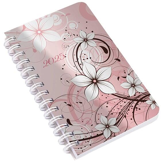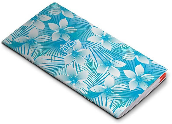Realsystem 2025 Zsebirka 8011-51 kékvirág naptár Puhatáblás, tűzött zsebnaptár, 2 heti beosztássú, 64 oldal, irkafűzéssel, 70g-os fehér papírral. Egyediesítés: présfólia, szita. Méret: 80x150 mm