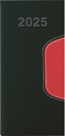 Határidőnapló Period Standard Zsebnaptár álló fekete műbőr 2025 Méret: 90×165 mm Terjedelem: 140 oldal (16 információs oldal, 112 naptároldal, 2026 januári tervező, jegyzetek, telefonregiszter) Naptárbeosztás: hétköznap 8–17 órás, heti beosztás Papír: 70 g/m2 ofszet, fehér Nyomás: 2+2 szín, szürke-piros Naptárfedél: műbőr Kötészet: cérnafűzött Extra: sarokperf
