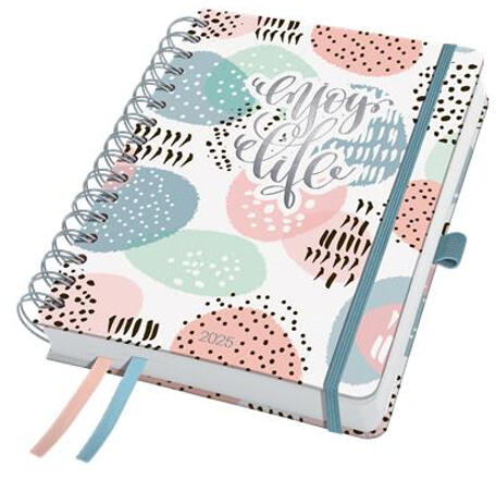 Kalendart Joy 2025 J022 B6 Art napi beosztású határidőnapló Színes grafikákkal díszített, matt fóliával bevont, fehér tömbös napi naptár. B6 méretű, napi beosztású, 352 oldal, oromszegővel, jelzőszalaggal és térképpel. Méret: 120x170 mm