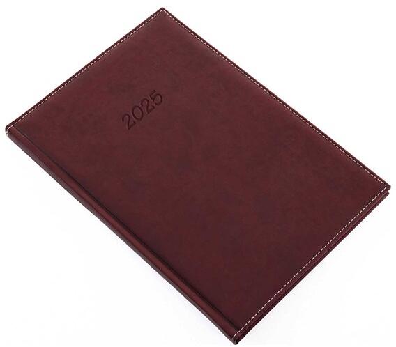 Hőre színeződő matt, varrott műbőr borítással, présfólia és vaknyomással emblémázható. Sárga papíros, cérnafűzött, B/5 heti beosztású, 144 oldalas, sarokperforált, jelzőszalagot és térképet tartalmaz.