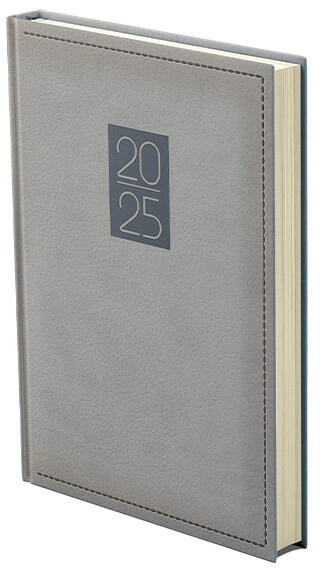 Határidőnapló TOPTIMER Classic C021 A/5 napi sárga lapos szürke 2025. Prégelt, bőrhatású, hőre színeződő műbőr bevonóval készült naptár, díszkerettel és elegáns évszámmal. Chamois (krémszínű) tömbös naptár, színes oromszegővel, jelzőszalaggal és sarokperforációval. Vaknyomással és lézergravírozással emblémázható
