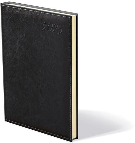 Kalendart Image 2025 I011 B5 heti beosztású fekete határidőnapló Magas fényű, bőrhatású, hőre színeződő műbőr bevonóval, varrott kerettel és légies évszámmal készített, chamois (krémszínű) tömbös határidőnaplkó. B5 méretű, heti beosztású, 114 oldal, oromszegővel, jelzőszalaggal, sarokperforációval és térképpel. Vaknyomással és présfólianyomással és s