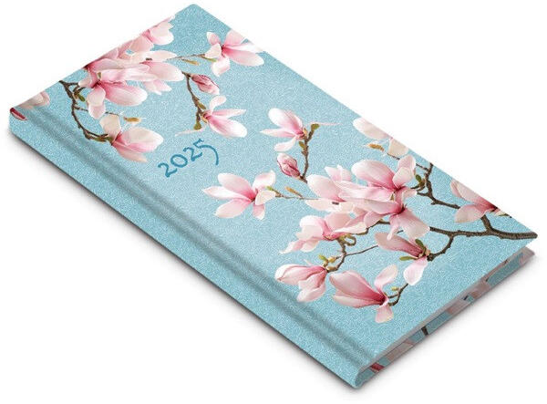 Realsystem 2025 Picture 5811-63 magnólia álló zsebnaptár Különböző felületnemesítéssel, illetve fóliával bevont papírborító, sarokperforációval. A zsebnaptár heti beosztású, álló, 144 oldal, 13 hónapos, cérnafűzéssel, 70g-os fehér papírral. Egyediesítés: présfólia, fémsarok (arany/ezüst). Méret: 90x165mm