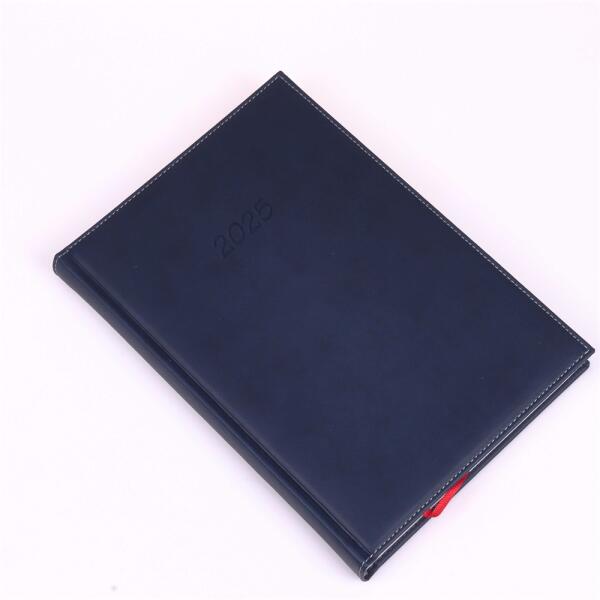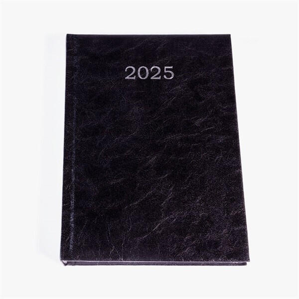 Office Depot A5 2025 napi beosztású fekete határidőnapló Fényes műbőr bevonóval készült, fehér tömbös napi naptár, jelzőszalaggal. Szitázással, présfólia- és vaknyomással emblémázható