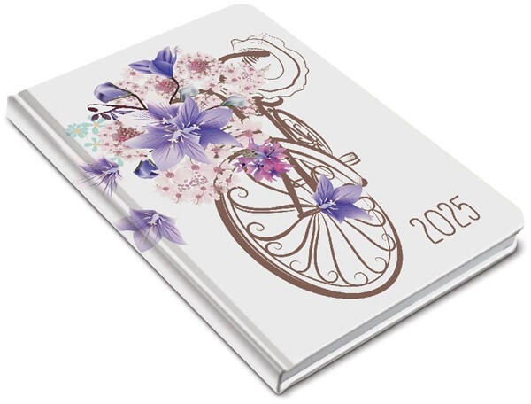 Realsystem 2025 Fiestina 5411-62 bicikli B6 zsebnaptár 3D-lakkal felületnemesített, kemény táblával, lekerekített sarokkal és színes gumiszalaggal biztosított B6 méretű zsebnaptár. Heti beosztású, 160 oldal, 70g fehér papírral, cérnafűzéssel, jelzőszalaggal és sarokperforációval. Méret: 115x165 mm (B6)