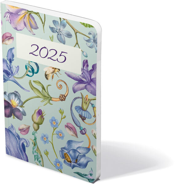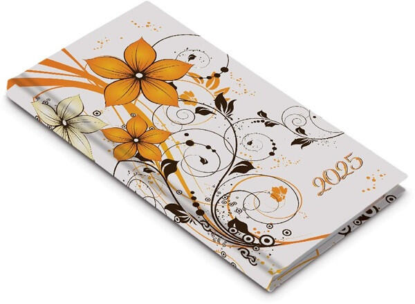 Realsystem 2025 Picture 5811-61 virágminta álló zsebnaptár Különböző felületnemesítéssel, illetve fóliával bevont papírborító, sarokperforációval. A zsebnaptár heti beosztású, álló, 144 oldal, 13 hónapos, cérnafűzéssel, 70g-os fehér papírral. Egyediesítés: présfólia, fémsarok (arany/ezüst). Méret: 90x165mm