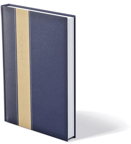 Kalendart Fashion 2025 F021 A5 napi beosztású kék-bézs-kék határidőnapló Kétféle, matt, bőrhatású és eltérő felületű, hőre színeződő műbőr bevonóval, varrással díszitett, fehér tömbös határidőnapló. A5 méretű napi beosztású, 352 oldal, oromszegővel, jelzőszalaggal, sarokperforációval és térképpel. Vaknyomással és présfólianyomással emblémázható.