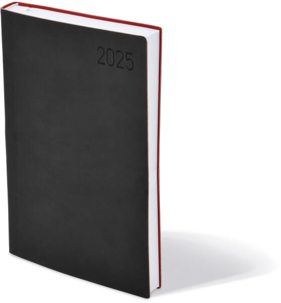 Fashion típusú, merészen struktúrált felületű, magas minőségű műbőr borítás, vaknyomással emblémázható. Fehér papíros, cérnafűzött, fekvő zsebnaptár heti beosztású, 144 oldalas, sarokperforált, jelzőszalagot tartalmaz.