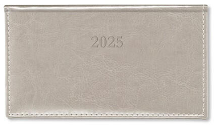 Határidőnapló Period Border Zsebnaptár fekvő Ezüst 2025 Méret: 165×90 mm Terjedelem: 140 oldal (16 információs oldal, 112 naptároldal, 2026 januári tervező, jegyzetek, telefonregiszter) Naptárbeosztás: hétköznap 8–17 órás, heti beosztás Papír: 70 g/m2 ofszet, fehér Nyomás: 2+2 szín, szürke-piros Naptárfedél: körbevarrott PU műbőr Kötészet: cérnafűzött Extra: sa