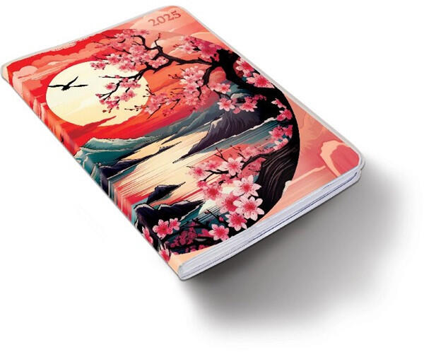 Realsystem 2025 Fiestina Light 5411-70 cseresznyevirág B6 zsebnaptár Átlátszó műanyag tokba helyezett agenda, golyóstolltartóval és névjegytartóval. Formálja a termék borítóját a saját arculatára, szerkessze meg, nyomtassa ki és helyezze be a műanyag tokba az új borítóképet. Heti beosztású, 160 oldal, 70g fehér papírral, cérnafűzéssel. Méret: 115x165 mm (B6)