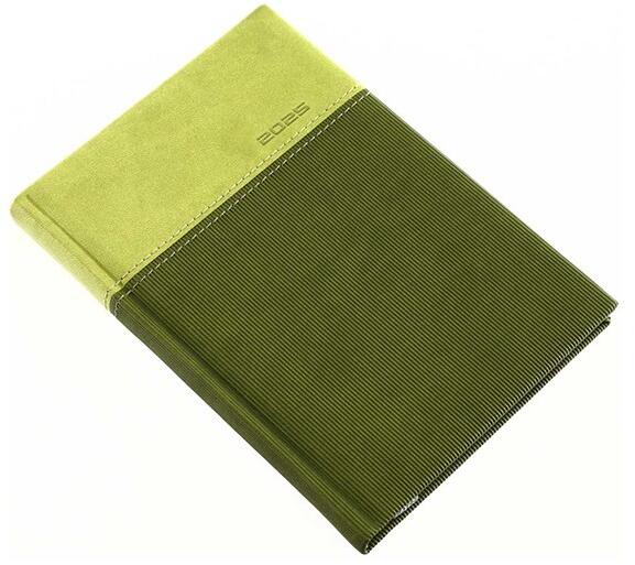 Hőre színeződő matt, varrott műbőr, borítással, présfólia és vaknyomással emblémázható. Fehér papíros, cérnafűzött, B/6 heti beosztású, 144 oldalas, sarokperforált, jelzőszalagot tartalmaz.