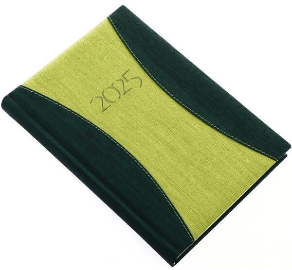 Realsystem 2025 PrémiumA 9322-78 A5 napi beosztású zöld határidőnapló Exkluzív műbőrök, íves varrással, jelzőszalaggal és sarokperforációval. A5 napi beosztású, 352 oldal, cérnafűzéssel, 70 g-os chamois papírral. Egyediesítés: vakdombor, fémsarok (arany/ezüst). Méret: 145x205 mm