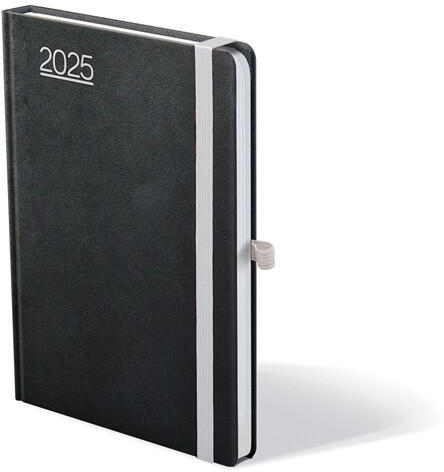Kalendart Nero 2025 N012 B6 heti beosztású fekete-szürke határidőnapló Fényes műbőr bevonóval, az átfogó gumiszalag színével megegyező évszámmal, tolltartóval, és sarokkerekítéssel készített, fehér tömbös naptár. B6 méretű, heti beosztású, 144 oldal, a gumiszalag színével harmonizáló oromszegővel, jelzőszalaggal és térképpel. Szitázással, présfólia- és