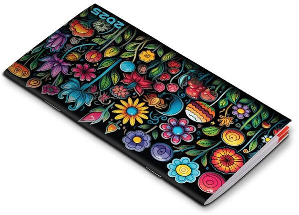 Realsystem 2025 Zsebirka 8011 motívum zsebnaptár Puhatáblás, tűzött zsebnaptár, 2 heti beosztássú, 64 oldal, irkafűzéssel, 70g-os fehér papírral. Egyediesítés: présfólia, szita. Méret: 80x150 mm