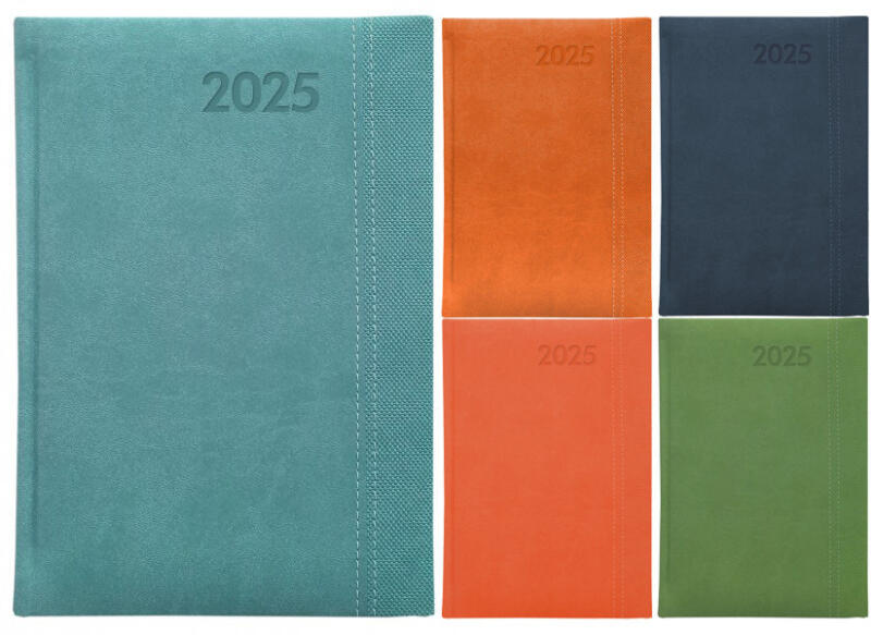 fényes, műbőr borító időbeosztás: félórás, 7-23.00 h lap típusa 70g, fehér ofszet jelzőszalaggal térképpel sarokperforációval szürke-kék nyomat éves tervező havi előjegyzés telefonregiszter/jegyzet oldalak