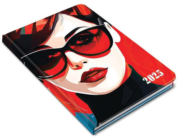 Realsystem 2025 Fiestina 5411-63 woman B6 zsebnaptár 3D-lakkal felületnemesített, kemény táblával, lekerekített sarokkal és színes gumiszalaggal biztosított B6 méretű zsebnaptár. Heti beosztású, 160 oldal, 70g fehér papírral, cérnafűzéssel, jelzőszalaggal és sarokperforációval. Méret: 115x165 mm (B6)