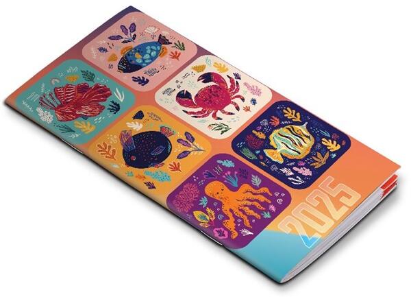 Többféle grafikával díszített, puha fedeles, fényes fóliával bevont, fehér tömbös naptár. B6 méretű, heti beosztású, 144 oldal, sarokkerekített. Méret: 120x170 mm