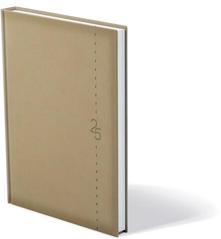 Kalendart Linea 2025 L015 A5 heti beosztású bézs határidőnapló Matt, bőrhatású, hőre színeződő műbőr bevonóval, függőleges dísztűzéssel készült, fehér tömbös. A5 méretű, heti beosztású, 144 oldal, oromszegővel, jelzőszalaggal és sarokperforációval és térképpel. Vak-, és szitanyomással valamint présfólianyomással emblémázható. Mérete: 150x210 mm