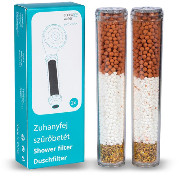 EconomyWater klórszűrős zuhanyfej betét, eltávolítja a vezetékes csapvízben található klórt és a nehézfémek nagy részét! Ezenkívül felfogja a lebegő mechanikai szennyeződéseket és antibakteriális hatásának köszönhetően az esetleg baktériumok és vírusok ellen is fellép. A csomag 2 db szűrőbetétet tartalmaz! A szűrőbetét felépítése: Kalcium-szulfit, KDF55 és