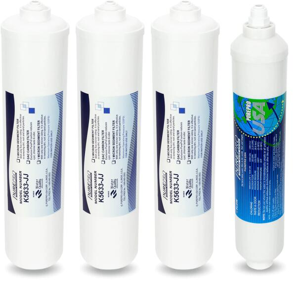 PurePro "K" szériás fordított ozmózis rendszerű víztisztító készülék csere szűrőbetét készlet. Az összes előszűrőt és az In-Line rendszerű utószűrőt is tartalmazza! Az alábbi berendezésekkel kompatibilis: K300, K500, K800, "Sailboat", "Tulip" Kompakt kivitelűek, így külön szűrőház nélkül, közvetlenül (In-Line) csatlakoztathatók a víztisztító rendszerbe. Ez