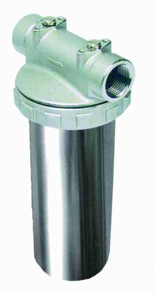 Réz/rozsdamentes szűrõház 3 részes kivitelben. A szűrõház fejrésze nikelezett réz, a pohár AISI 304 rozsdamentes acél. A betéttõl függõen, mindig az általunk kiválasztott feladatnak megfelelõ szűrést biztosít. A fej réz légtelenítõ csavarral ellátott, illetve egy plusz csatlakozás is található rajta nyomásmérõ órának. A szűrõházak az európai szabványoknak me