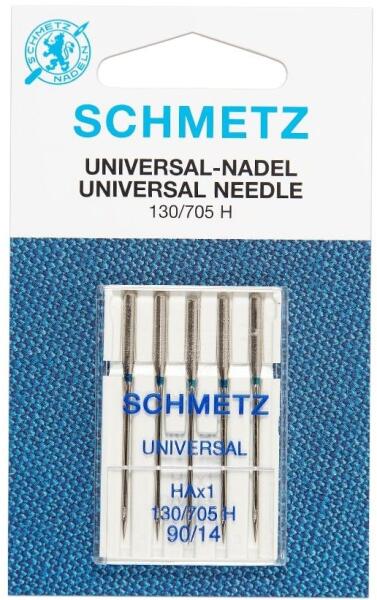 Schmetz univerzális varrógéptű. A SCHMETZ gépi varrótűk a világ élvonalába tartozó termékei. Gyártva: USA Gyári kód: 130/705 H Méret: 90/14 Színkód: narancs A csomag tartalma: 5 varrógéptű Lapolt oldalú géptű, általános felhasználásra. 60-70 vékony anyagokhoz, 80-90 közepesen vastaghoz, 100-120 vastagabb anyagokhoz. ---- A Schmetz német eredetű varrógép-tűket 185