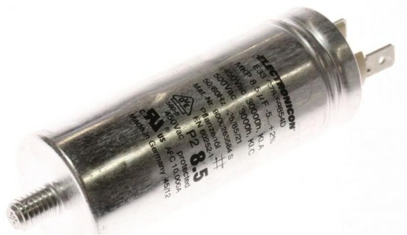 Fémpapír kondenzátor, egyik oldalán M8 menettel, másik oldalán 2 dugós csatlakozással. Lehetséges cikklenyomat: MAB MKP 8,5 / 500/1380 MKP8,5?F + 2 / -5% 420VAC 30000h / KlA 470VAC 10000h / KlB 500VAC 1000h / KlD -25/85/21 50 / 60Hz 9000731017 450VAC 60Hz -25 / + 85 ° C 10.000 AFC