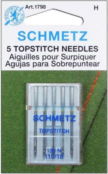 Schmetz TopStitch, nagylyukú varrógéptű. A SCHMETZ gépi varrótűk a világ élvonalába tartozó termékei. Gyártva: USA Gyári kód: 130N Méret: 110/18 Színkód: világoszöld A csomag tartalma: 5 varrógéptű Lapolt oldalú géptű, extra nagy tűfokkal, vastag cérnához, vastag anyagokhoz, dísztűzéshez. A Topstitch tű sokféle szövettel használható. ---- A Schmetz német erede